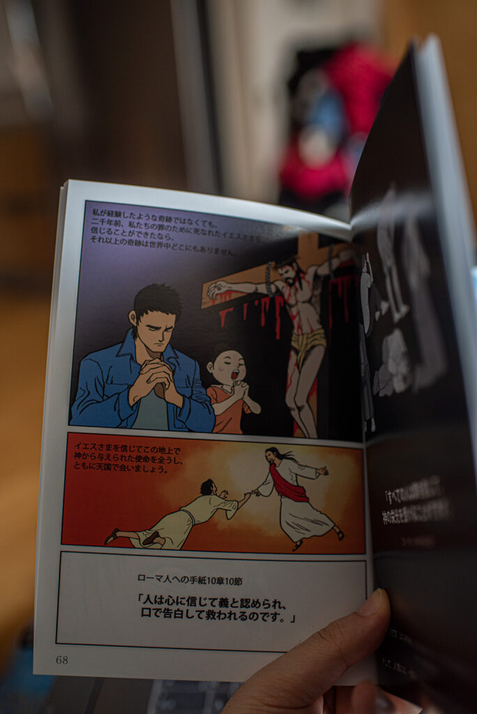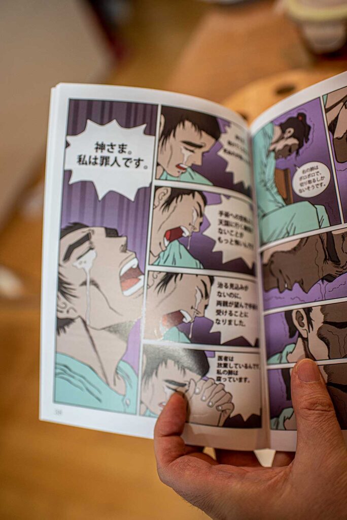 그 말씀을 듣는 순간, “아, 왜 하나님께서 나를 신바울 목사님께로 인도하셨는지 알 것 같다”는 생각이 들었다. 동시에 “이 만화책을 일본어로 번역해 일본의 각 교회들에게 보내라는 것이구나!” 하는 순간적인 깨달음이 왔다. 목사님과 대화 중, 아주 짧은 1초도 안 되는 찰나에 그런 생각들이 뇌리를 스친 것이다.
